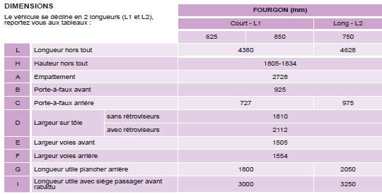 Le véhicule se décline en 2 longueurs (l1 et l2), reportez vous aux tableaux :